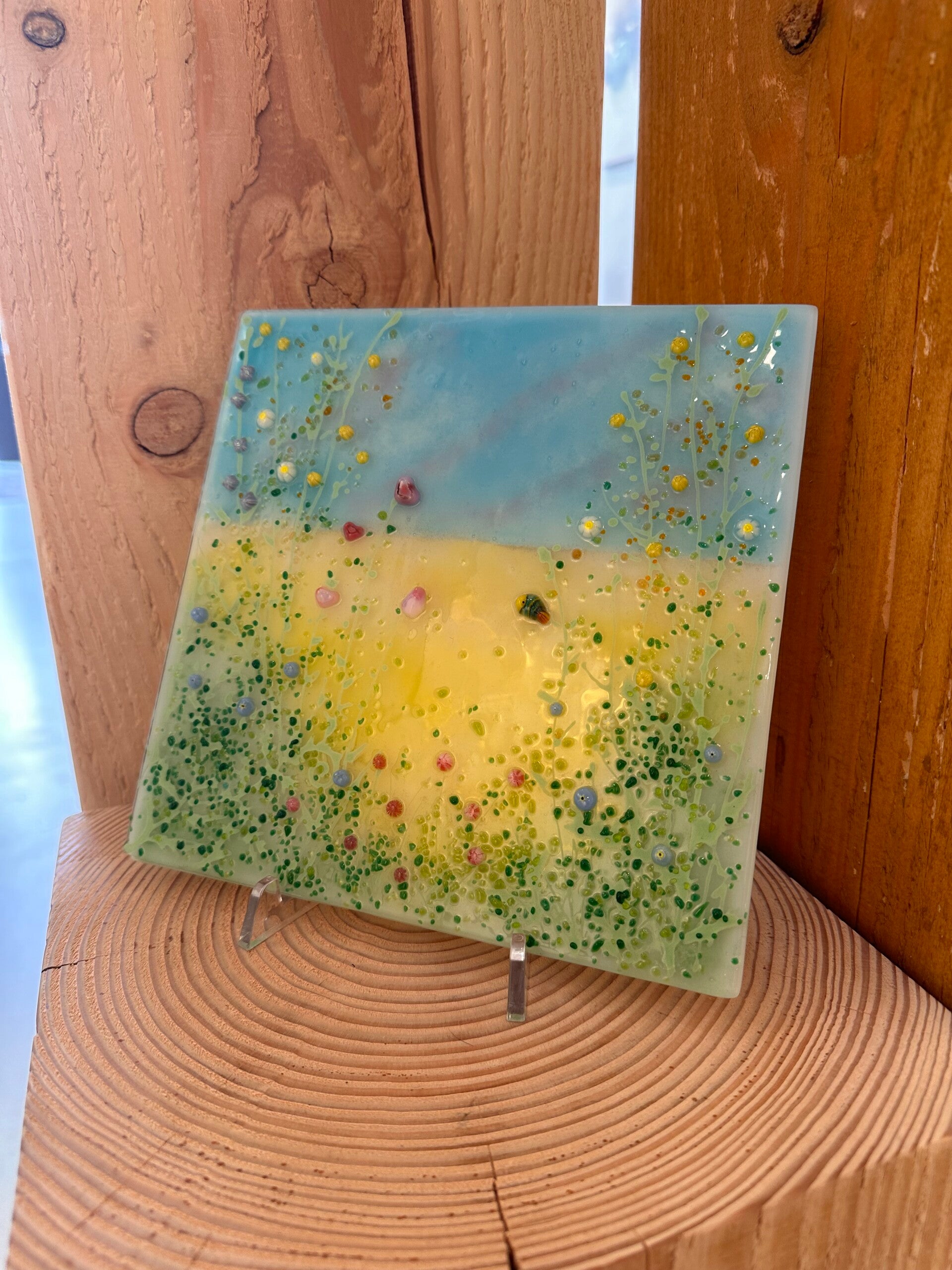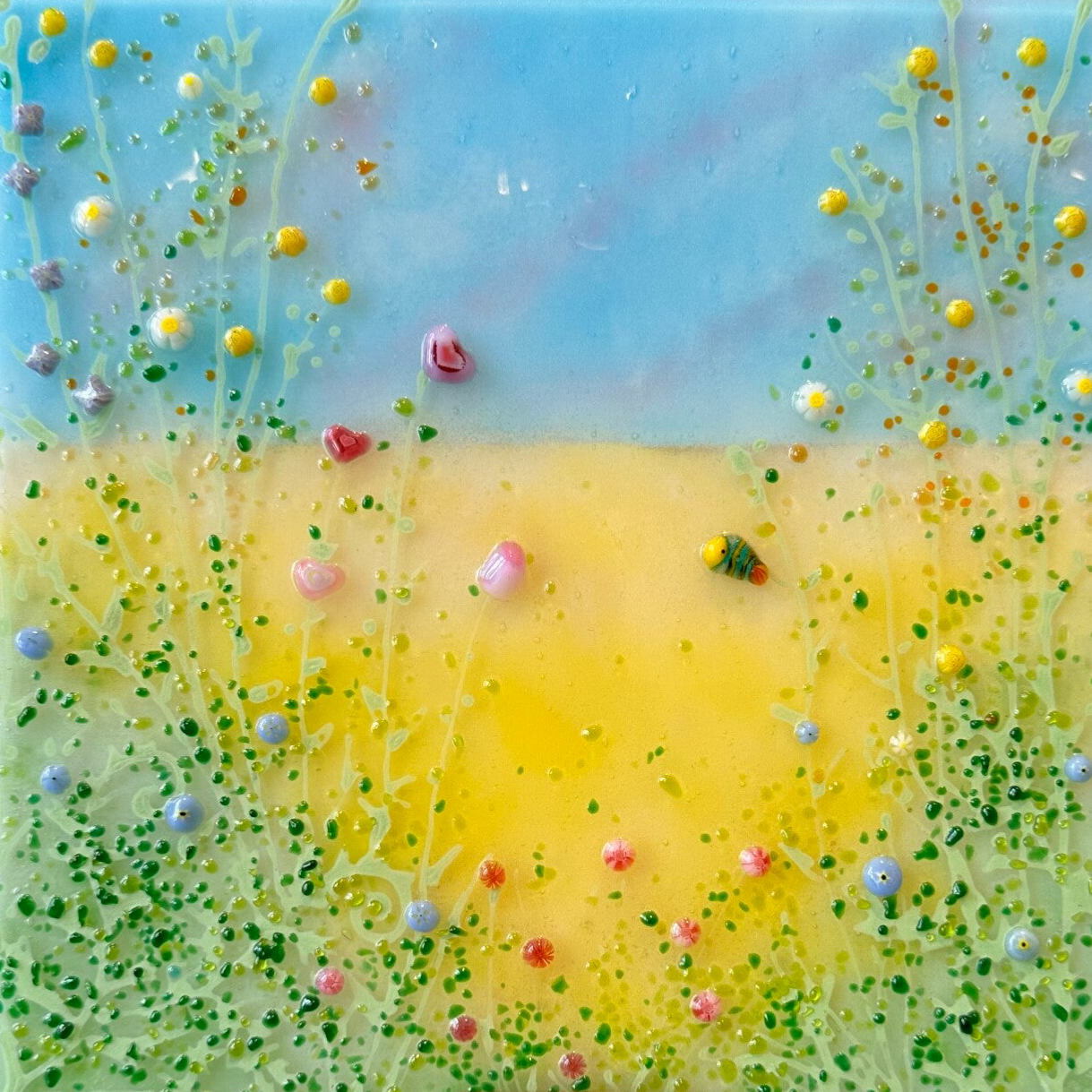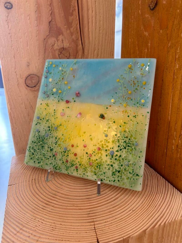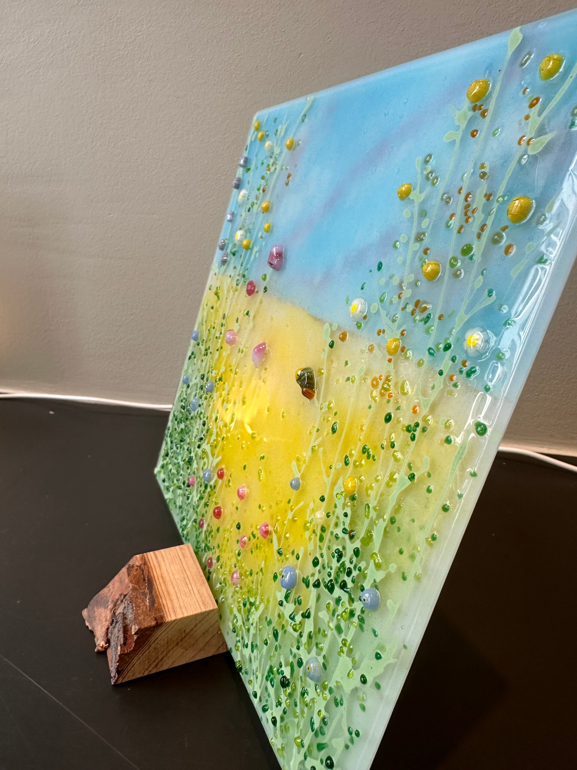 Een driedaags glaslandschap, de eerste laag vormt de achtergrond, de laag daarvoor de voorgrond en daarop zijn kleine bloemetjes aangenbracht.