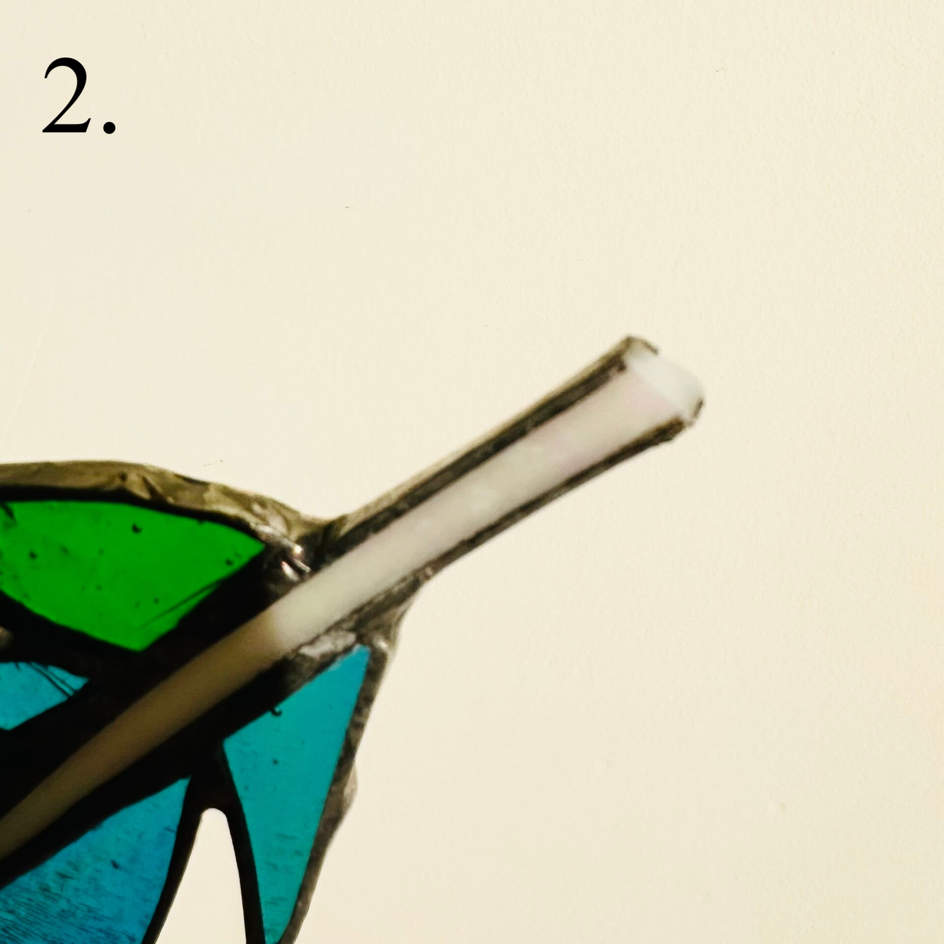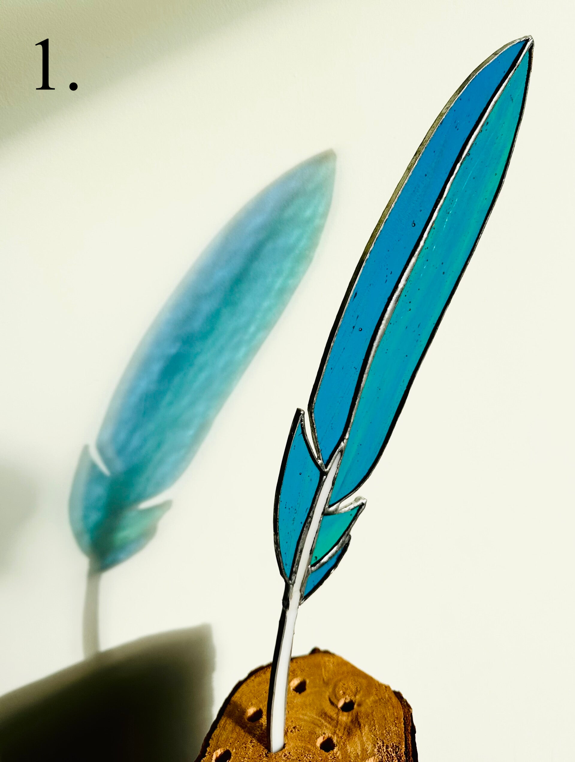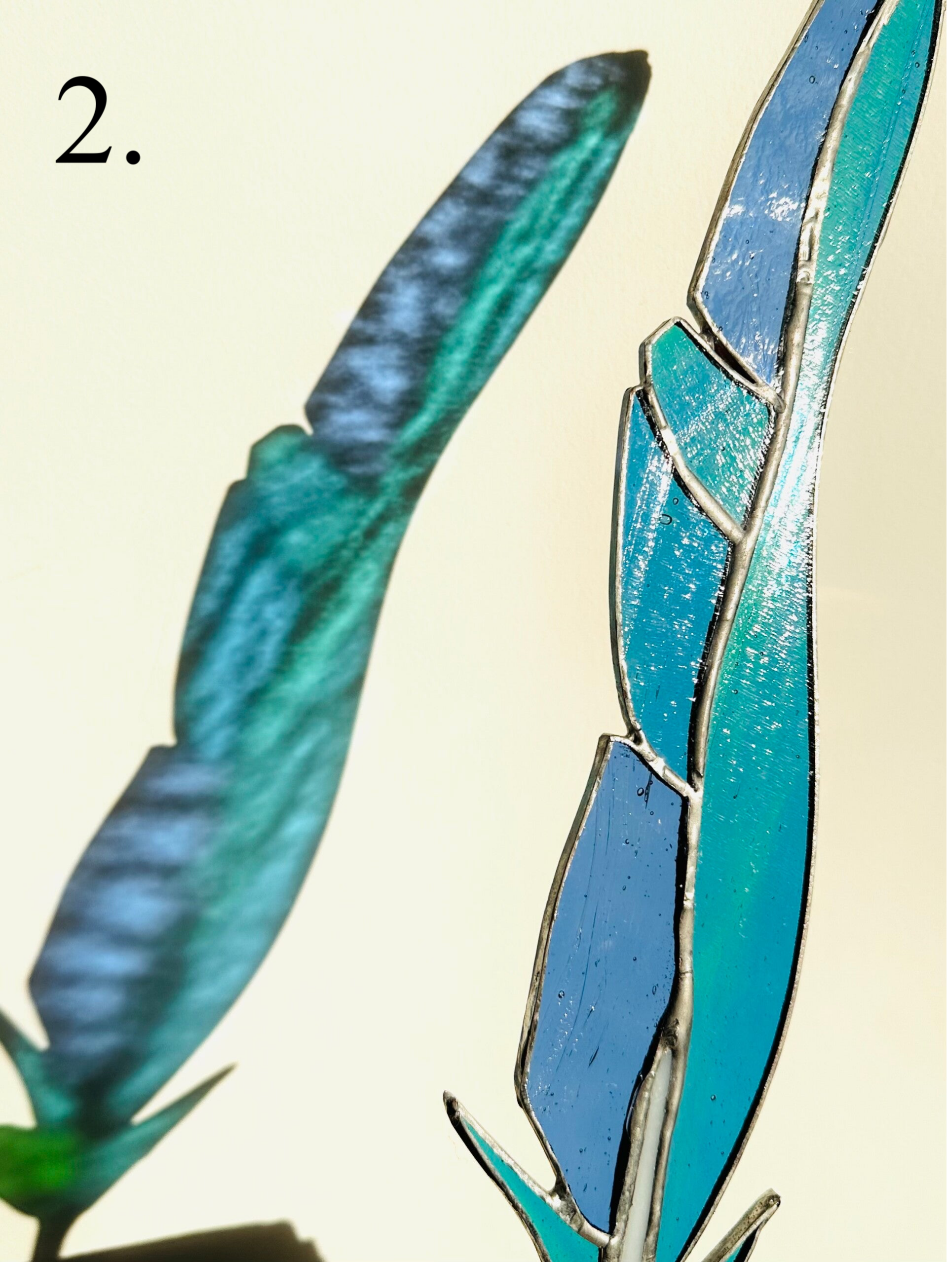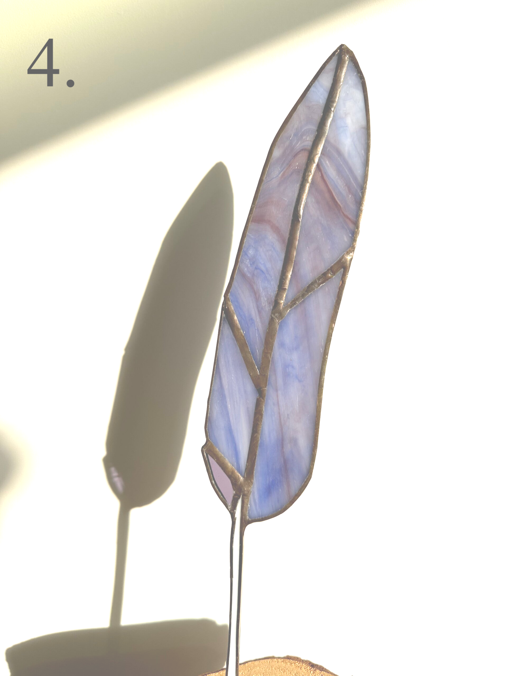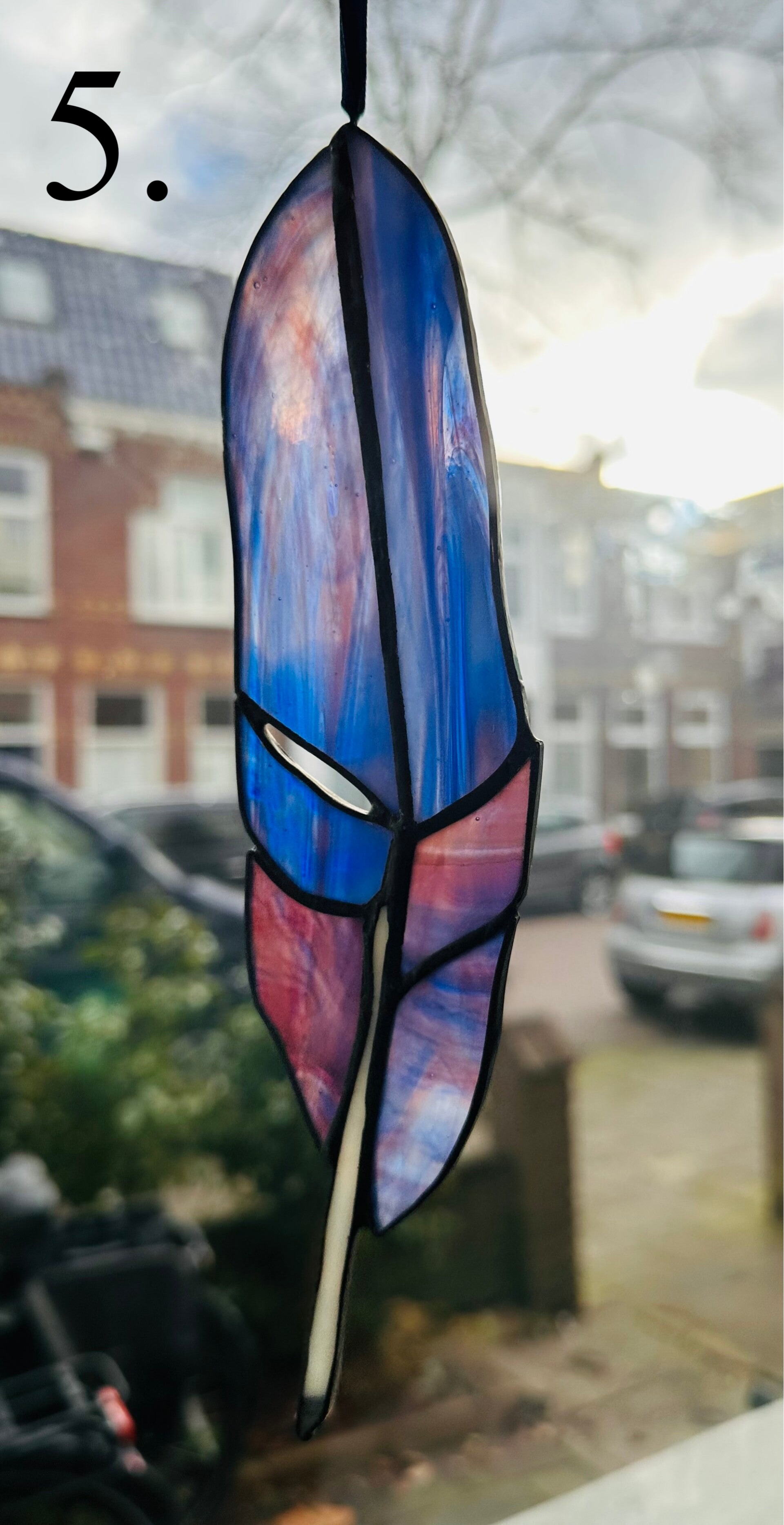 33 cm Opaal glas, paars/blauw/wit zwart soldeer. Geen bijzonderheden. Voor kleuren met tegenlicht zie de laatste foto van veer 5