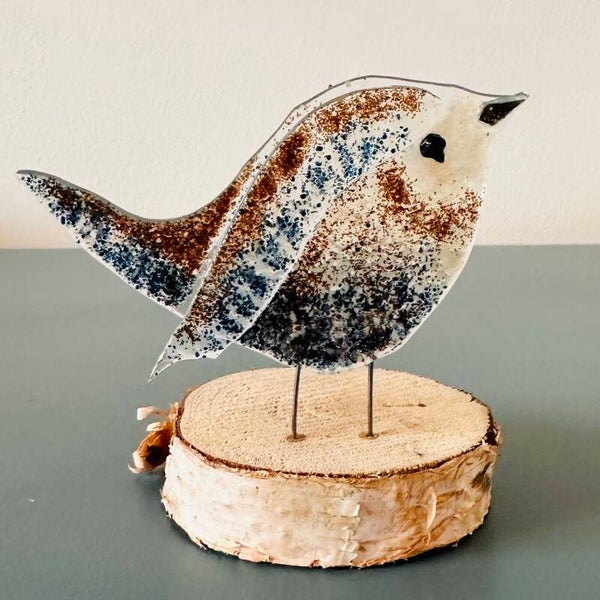 In de vacht van deze mus van glas zitten allerlei verschillende kleuren verstopt, samen maken ze een bruine vacht, met gekleurde accenten. De 'Bonte mus' is gemonteerd op een stammetje hout.