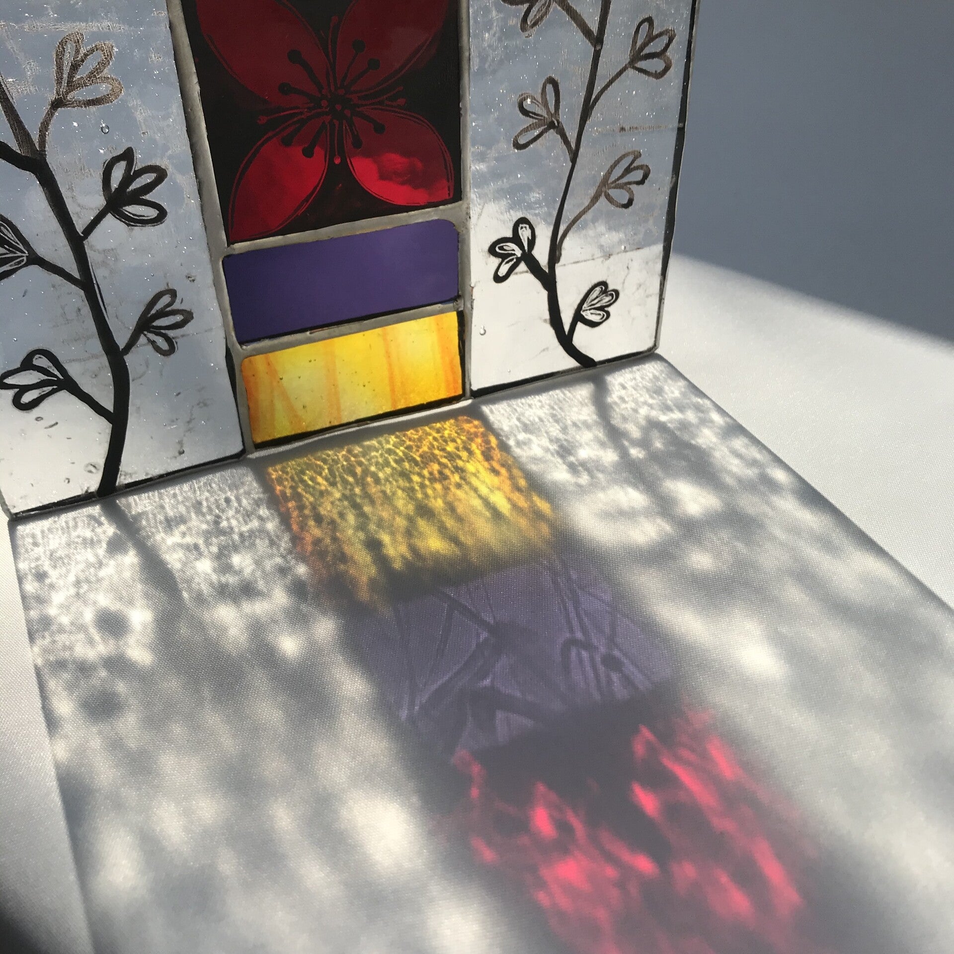 Deze raamhanger is gebrandschilderd op de traditionele manier. Prachtige kleuren in de zon, en een heel gezellige afbeelding.