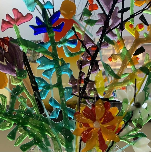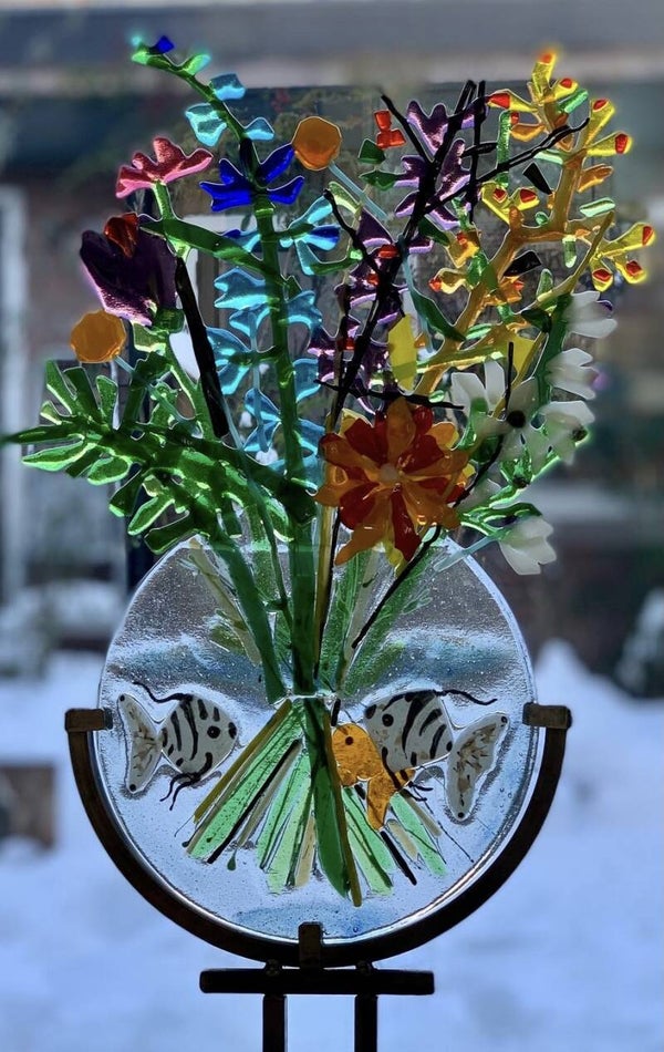Verschillende kleuren transparant en opaak glas wisselen elkaar af waardoor een bijzonder kleur en lichtspel ontstaat, extra sprankelend wanneer het zonlicht er op schijnt.